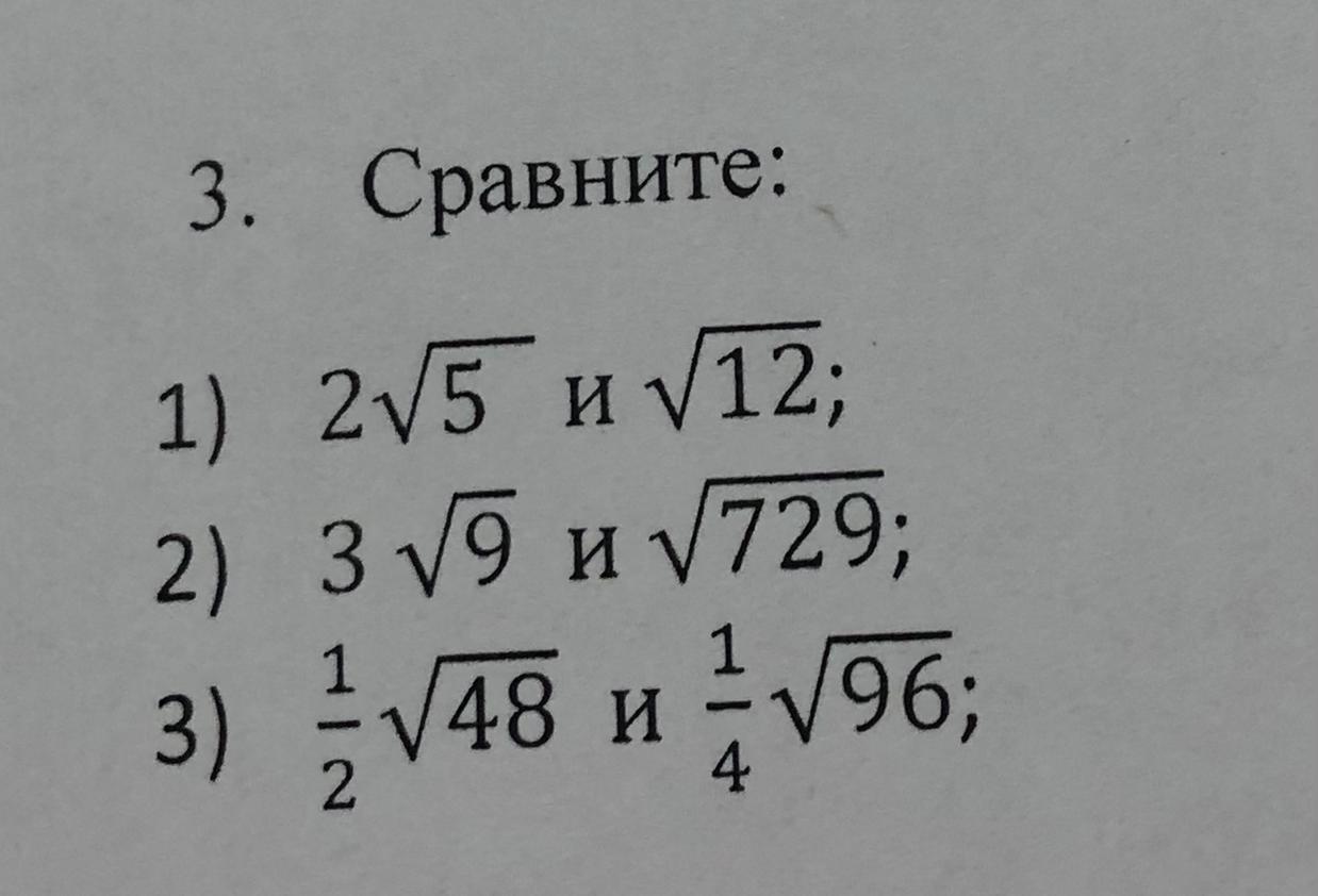 3 . 1) 2√5 > √12 ; 2) 3√9 < √729 ; 3) 1/2 √48 > 1/4 √96 ;