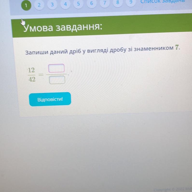 Для того щоб отримати з 12/42 дріб зі знаменником 7 потрібно поставити в знаменник 7 і порахувати на скільки ділиться 42 щоб в результаті отримати 7 це 6 значить потрібно 12:6=2 виходить 2/7