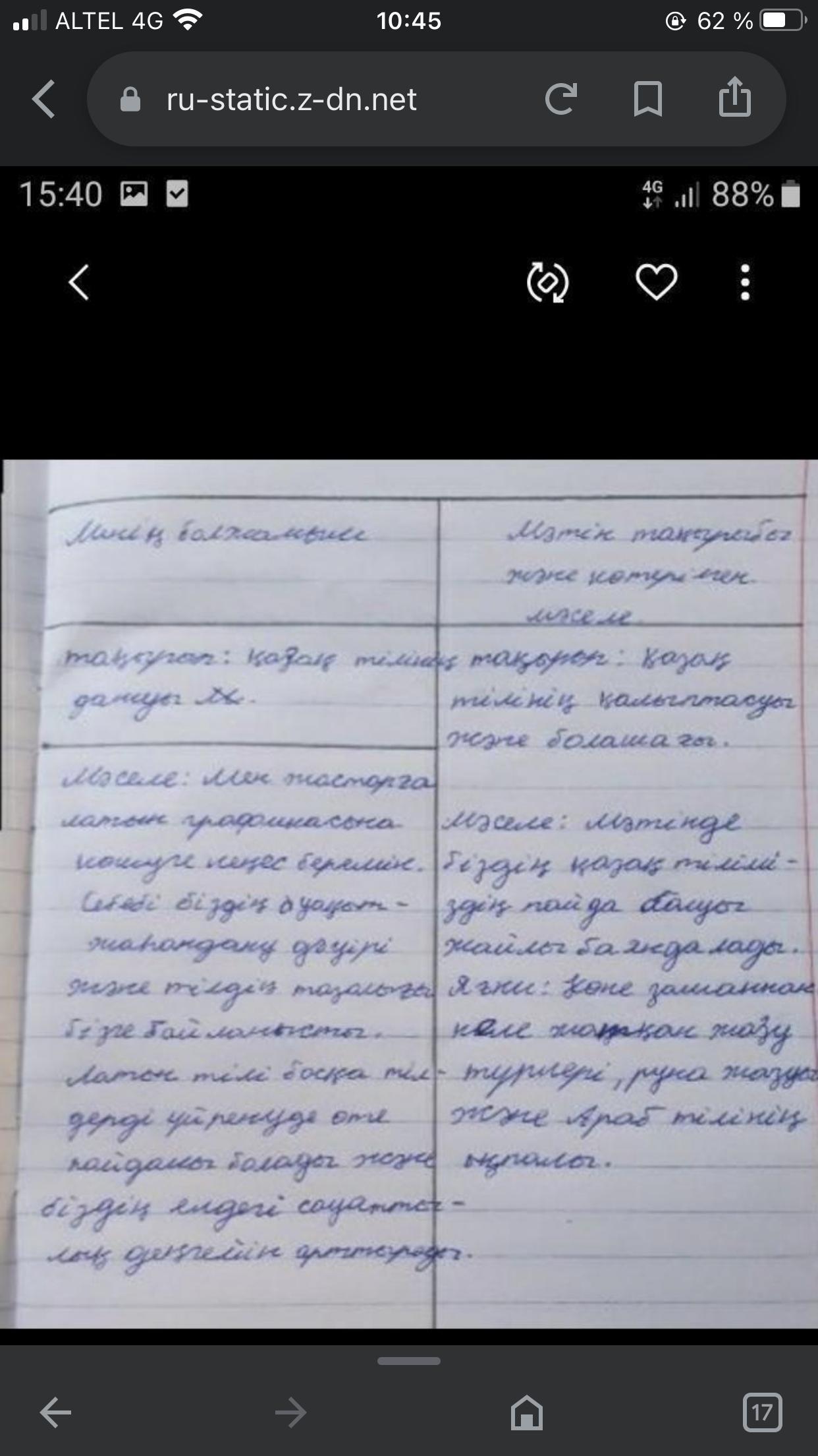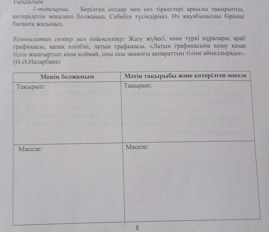 1-тапсырма. Берілген сөздер мен сөз тіркестерi аркылы такырыпты, кетерілетін мәселенi болжаныз. Себебiн түсiндiрiнiз. Өз жауабынызды бірінші бағанға жазыныз. Ұсынылатын сөздер мен дәйексөздер: Жазу жүйесі, көне түркі мұралары, араб графикасы, казак алiпбиi, латын графикасы, «Латын графикасына көшу казак тiлiн жангыртып кана коймай, оны осы заманғы акпараттын тіліне айналдырады». (Н.Ә.Назарбаев)