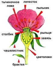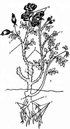5 - главный стебель; 6 - побеги от главного стебля; 7 - дикие побеги; 8 - листья; 9 - шипы; 10 - цветы