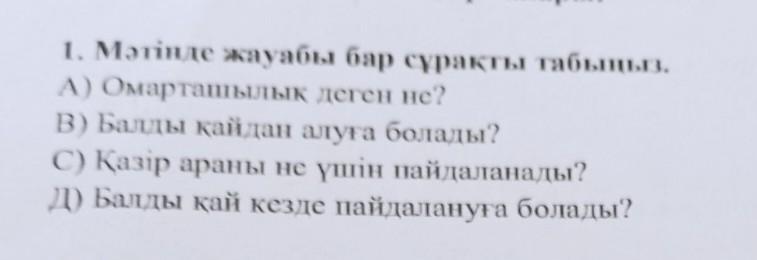 1. Мәтінде жауабы бар сұрақты табыңыз. A) Омарташылык деген не? В) Балды қайдан алуға болады? С) Қазір араны не үшiн пайдаланады? Д) Балды кай кезде пайдалануға болады?