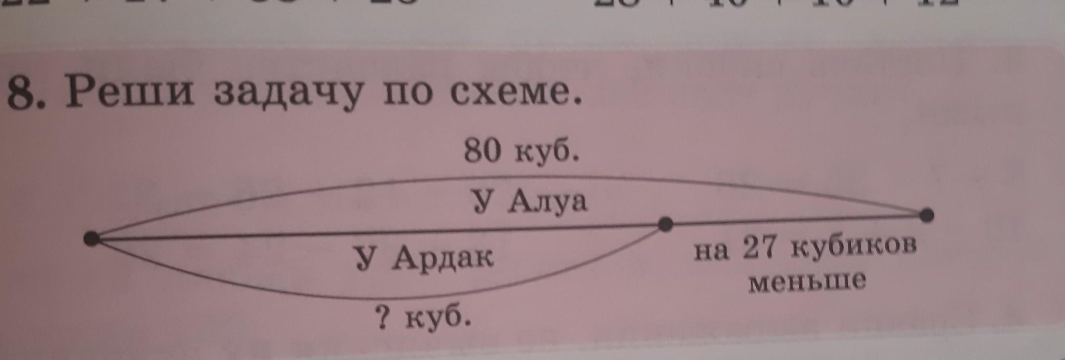 Покрокове пояснення: кількість кубіків у Алуа дорівнює кількість кубіків у Ардак + 27. 80-27=53 кубіка)
