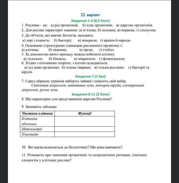 5. За допомогою якого приладу можна побачити клітину: а) телескоп; б) бінокль; в) мікроскоп; г) фонендоскоп. 6. Згідно з клітинною теорiєю, з клітин складаються: a) yci живі організми; б) тільки тварини; в) тільки рослини; г) бактерії та віруси.