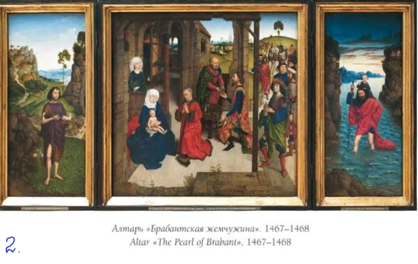 2. В приложении к заданию дана репродукция картины нидерландского живописца Дирка Баутса, представителя Северного Возрождения. Она является частью триптиха алтаря «Жемчужина Брабанта» (1467—1468). (приложение 2.) На ней изображен святой Христофор, несущий на плечах младенца Христа.
