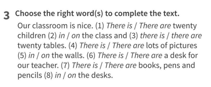 Our classroom is nice. (1) There is / There are twenty children (2) in / on the class and (3) there is/ there are twenty tables. (4) There is / There are lots of pictures (5) in / on the walls. (6) There is / There are a desk for our teacher. (7) There is / There are books, pens and pencils (8) in / on the desks.