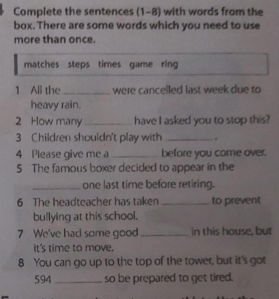 1) steps 2) times 3) matches 4) ring 5) game 6) steps 7) game 8) steps