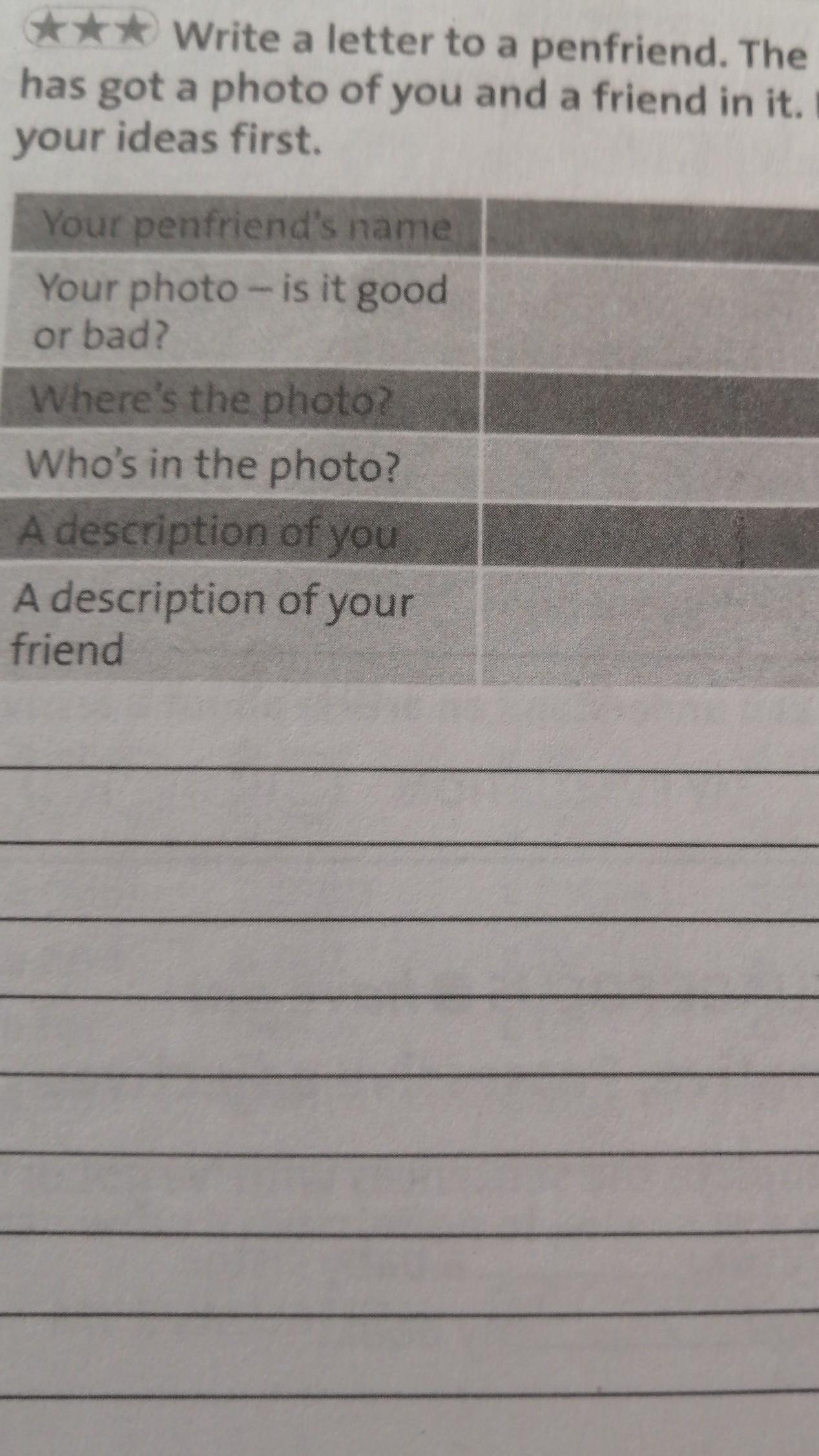 her n't 4 ★★★ Write a letter to a penfrien has got a photo of you and a friend in it. Plan your ideas first. eisn't cal Your penfriend's name Your photo - is it good or bad? Where's the photo? Who's in the photo? A description of you A description of your friend