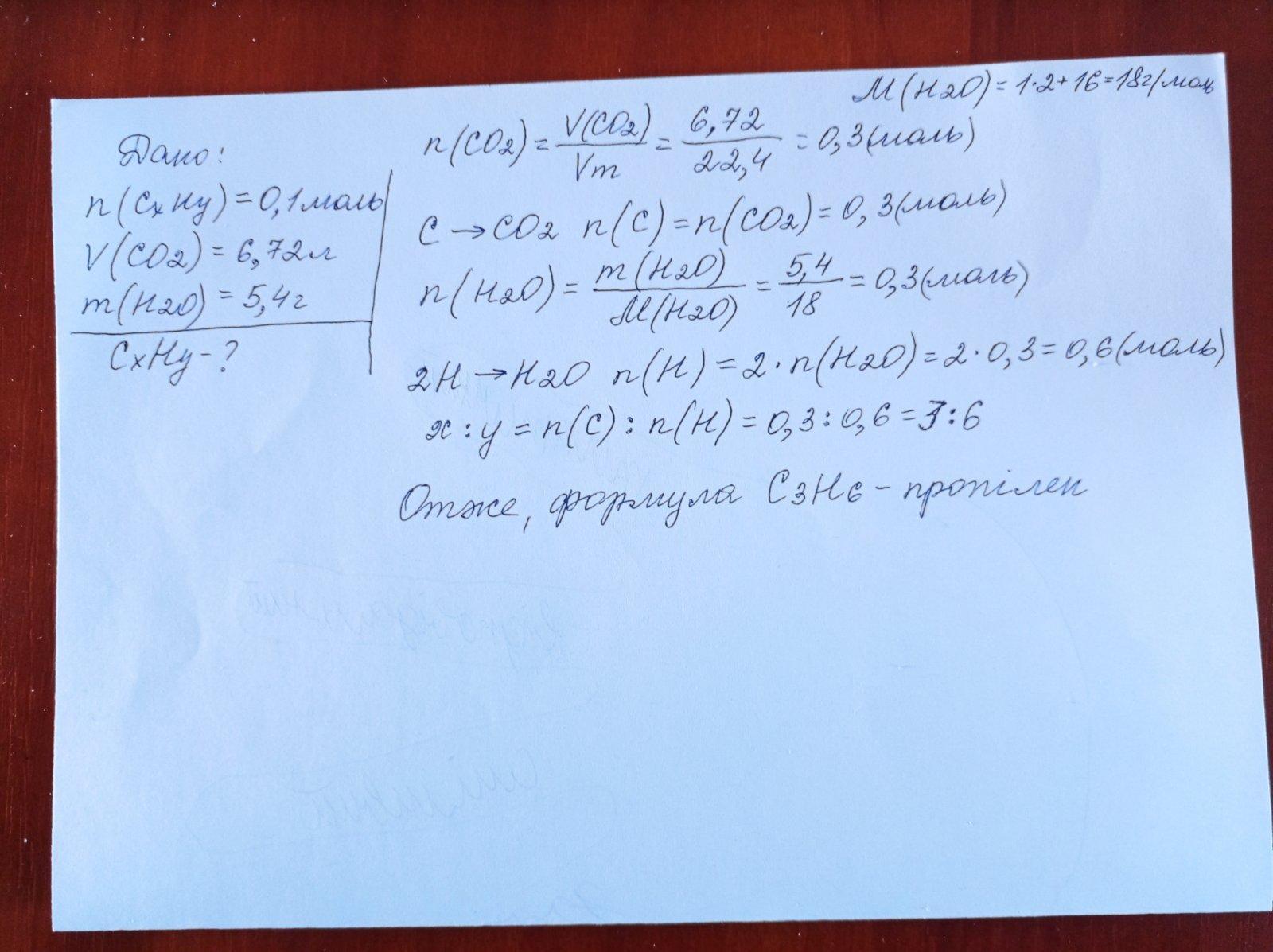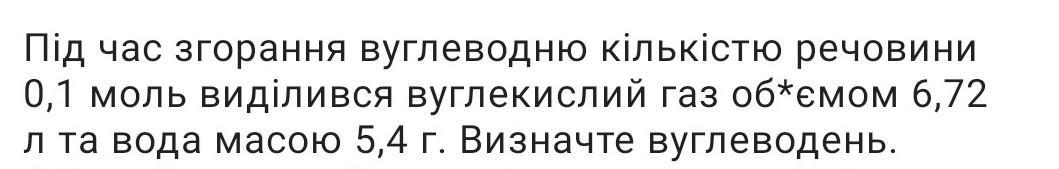 Під час згорання вуглеводню кількістю речовини 0,1 моль виділився вуглекислий газ об*ємом 6,72 л та вода масою 5,4 г. Визначте вуглеводень.