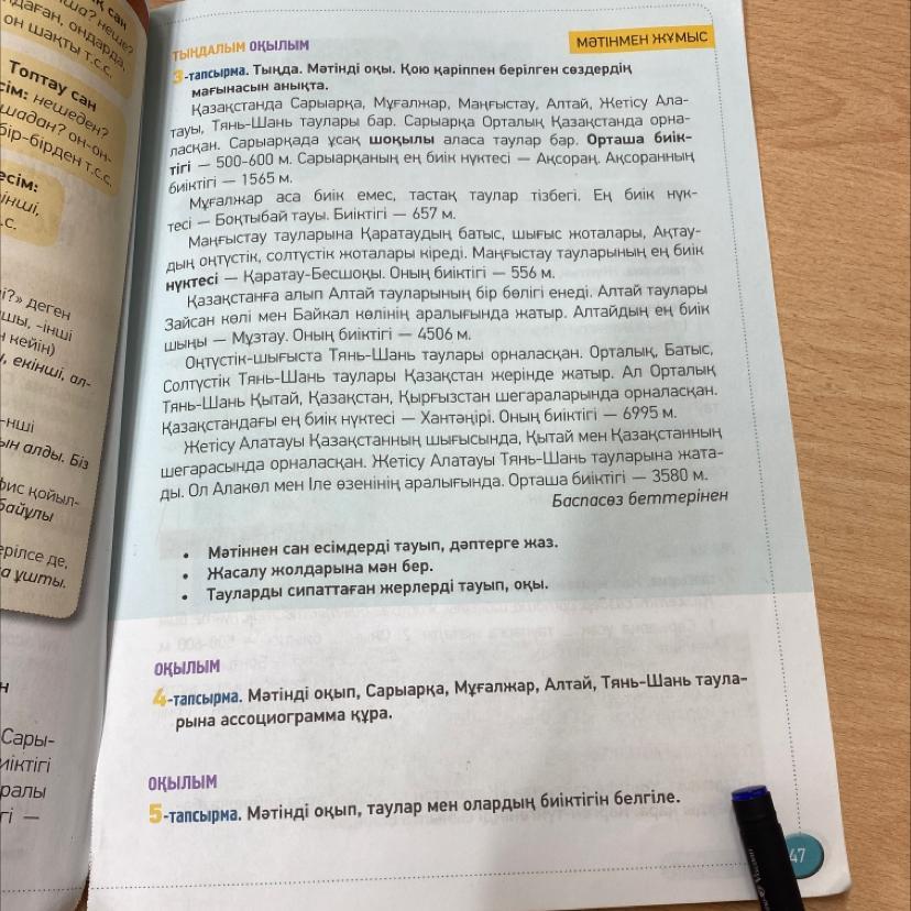 3- тапсырма. 47- беттегі 4-тапсырма. Мәтінді оқып. 5- сұрақ құрастыр.