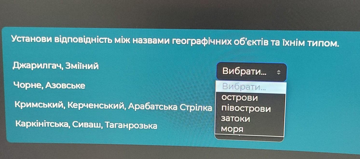 Установи відповідність між назвами географічних об'єктів та їхнім типом.