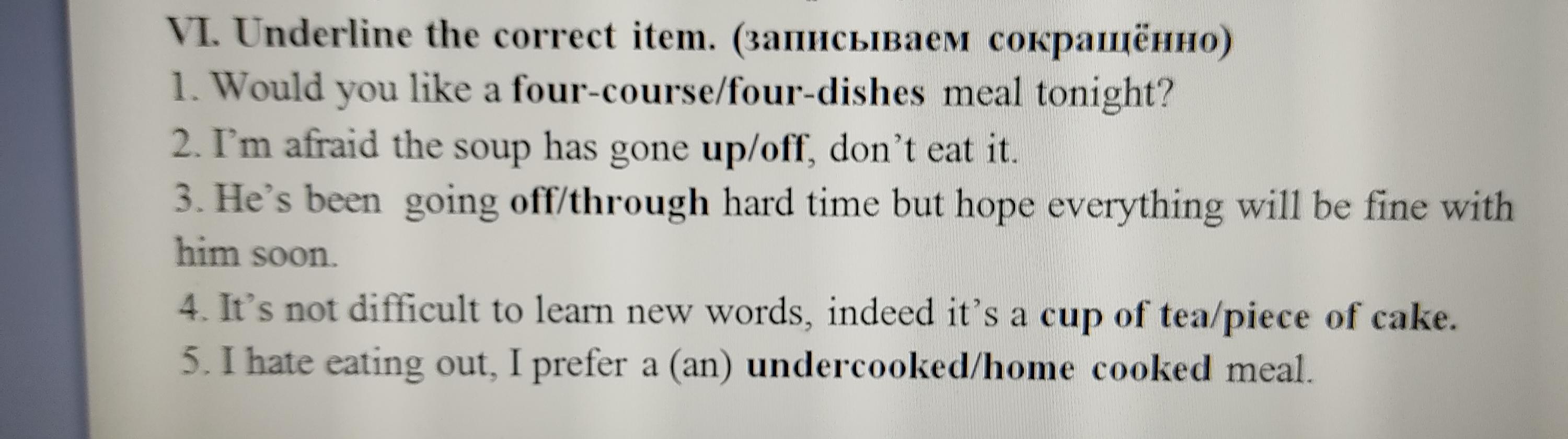 Ответ: 1Four dishes 2up 3trought. Piece of cake. Home