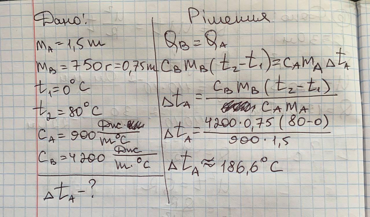 Як зміниться температура куска алюмінію,маса якого дорівнює 1,5кг якщо йому передати таку саму кількість теплоти що затрачається для нагрівання 750г води від 0°с до 80°с Питома теплоємність алюмінію дорівнює 900 дж кг °с питома теплоємність води 4200 дж кг °с Допоможіть дам 40 балів