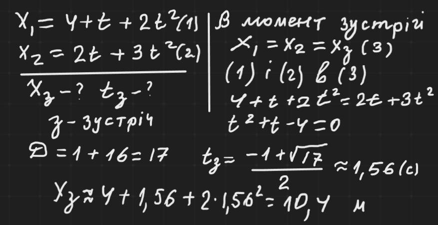 Рух двох тіл задано рівняннями x1=4+t+2t^2 та x2=2t+3t^2. Знайти місце та час зустрічі цих тіл. с объяснением