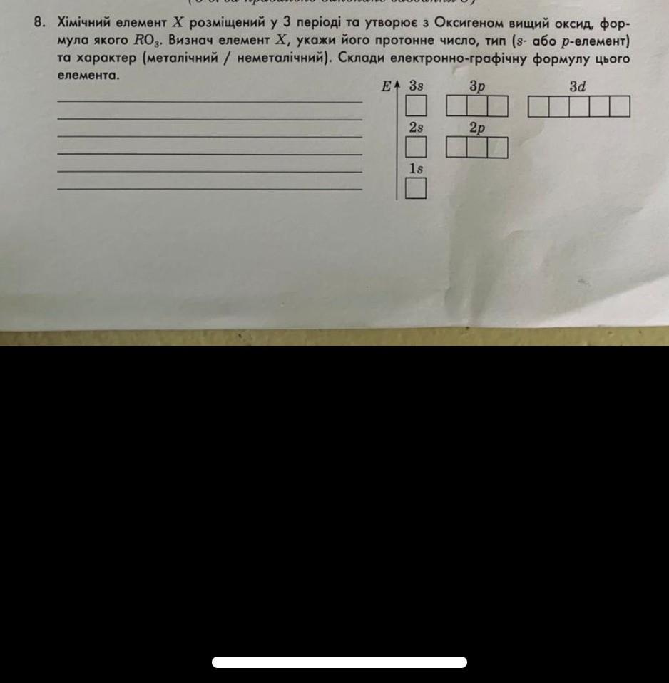 8. Хімічний елемент Х розміщений у З періоді та утворює з Оксигеном вищий оксид, фор- мула якого RO³. Визнач елемент Х, укажи його протонне число, тип (s- або р-елемент) та характер (металічний / неметалічний). Склади електронно-графічну формулу цього елемента. E+ 3s Зр 3d 2s 1s 2р