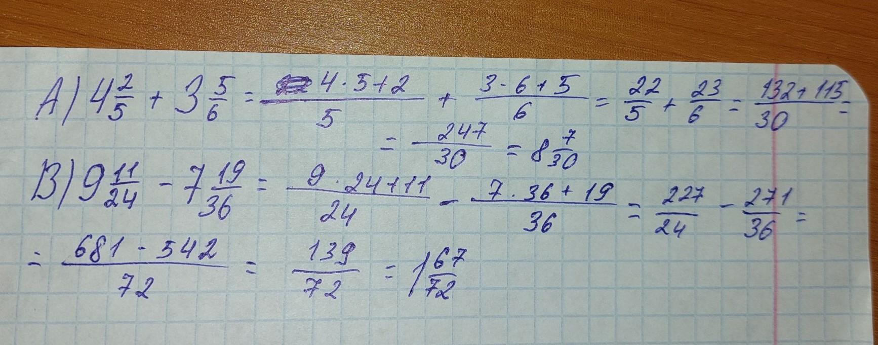Обчисліть: А)4целих 2/5+3целих 5/6 В) 9 целих 11/24-7целих 19/36