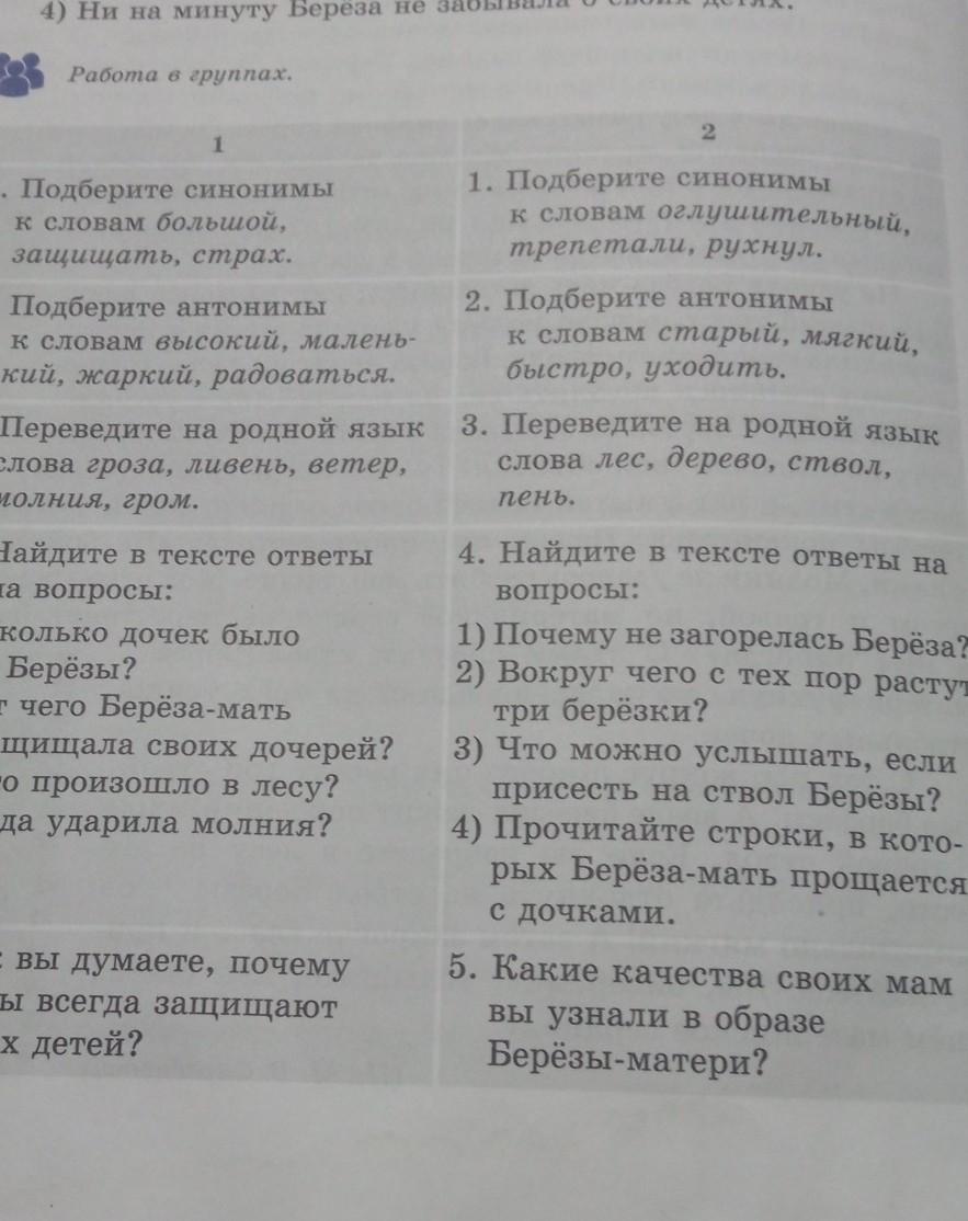 Работа в группах. 1 1. Подберите синонимы к словам большой, защищать, страх. 2. Подберите антонимы к словам высокий, малень- кий, жаркий, радоваться. 3. Переведите на родной язык слова гроза, ливень, ветер, молния, гром. 4. Найдите в тексте ответы на вопросы: 1) Сколько дочек было у Берёзы? 2) От чего Берёза-мать защищала своих дочерей? 3) Что произошло в лесу? 4) Куда ударила молния? 5. Как вы думаете, почему мамы всегда защищают 22 2 1. Подберите синонимы к словам оглушительный, трепетали, рухнул. 2. Подберите антонимы к словам старый, мягкий, быстро, уходить. 3. Переведите на родной язык слова лес, дерево, ствол, пень. 4. Найдите в тексте ответы на вопросы: 1) Почему не загорелась Береза? 2) Вокруг чего с тех пор растут три берёзки? 3) Что можно услышать, если присесть на ствол Берёзы? 4) Прочитайте строки, в кото- рых Берёза-мать прощается с дочками. 5. Какие качества своих мам вы узнали в образе Берёзы-матери? Помочь мне надо кто ответ сделать одам 20 балл пжжж 2 надо пжжжжжж