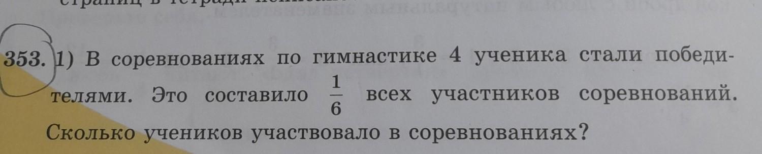 353. 1) в соревнованиях по гимнастике 4 ученика стали победи- телями. Это составило Сколько учеников участвовало в соревнованиях, 6 1 всех участников соревнований.