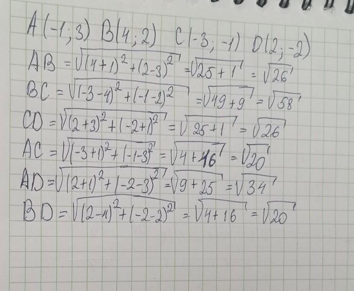 Дано точки А(-1; 3), В(4; 2), C(-3; -1), D(2; -2). Знайдіть координати векторів AB, BC, CD, AC, AD, BD. Чи е серед них рiвнi вектори?