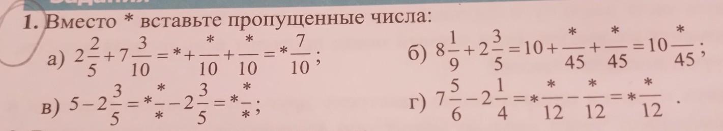 а) 2 целых 2/5+7 целых 3/10=9+4/10+3/10=9 7/10 б)5-2 целых 3/5=2 целых 2/5 в) 8 целых 1/9+2 целых 3/5=10+5/45+27/45=10 целых 32/45 г) 7 целых 5/9-2 целых 1/4=5 целых 20/36-9/36=5 целых 11/36