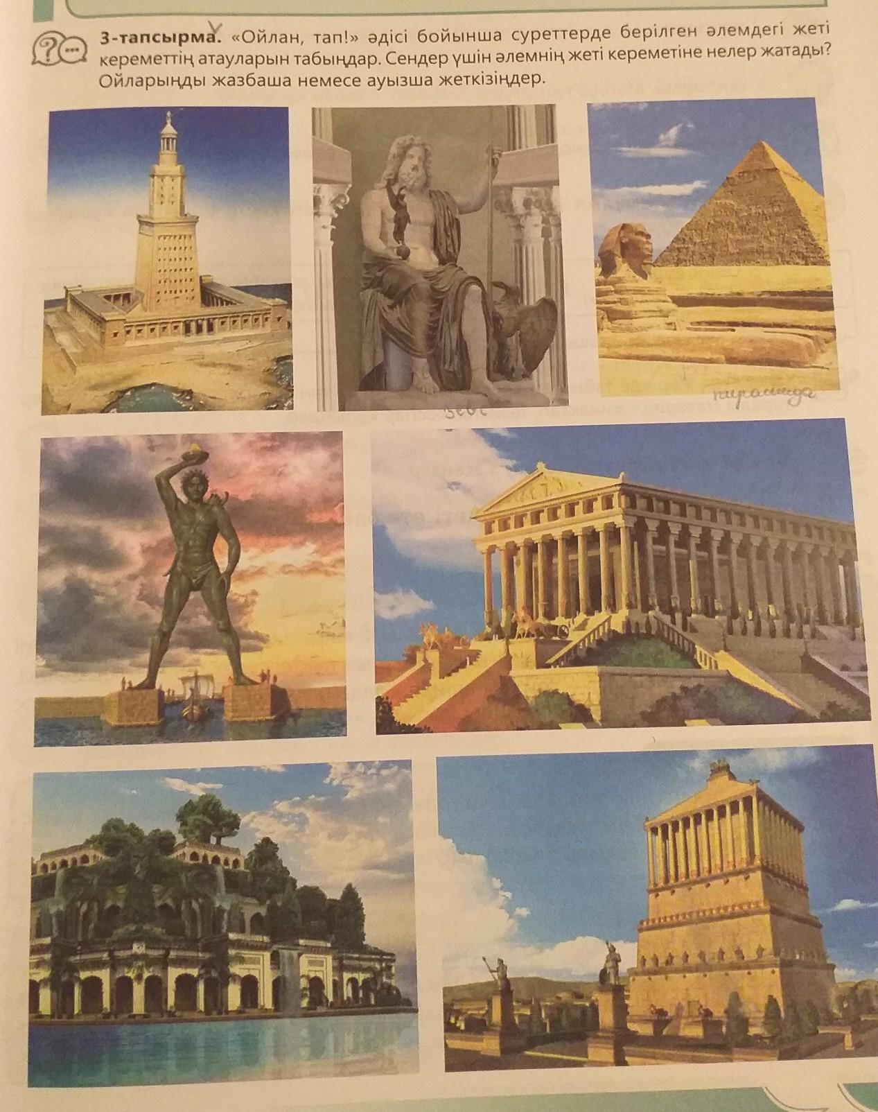 3-тапсырма. «Ойлан, тап!» адiсi бойынша суреттерде берілген алемдегi жетi кереметтің атауларын табыңдар. Сендер ушiн алемнің жеті кереметіне нелер жатады? Ойларыңды жазбаша немесе ауызша жеткізіңдер.