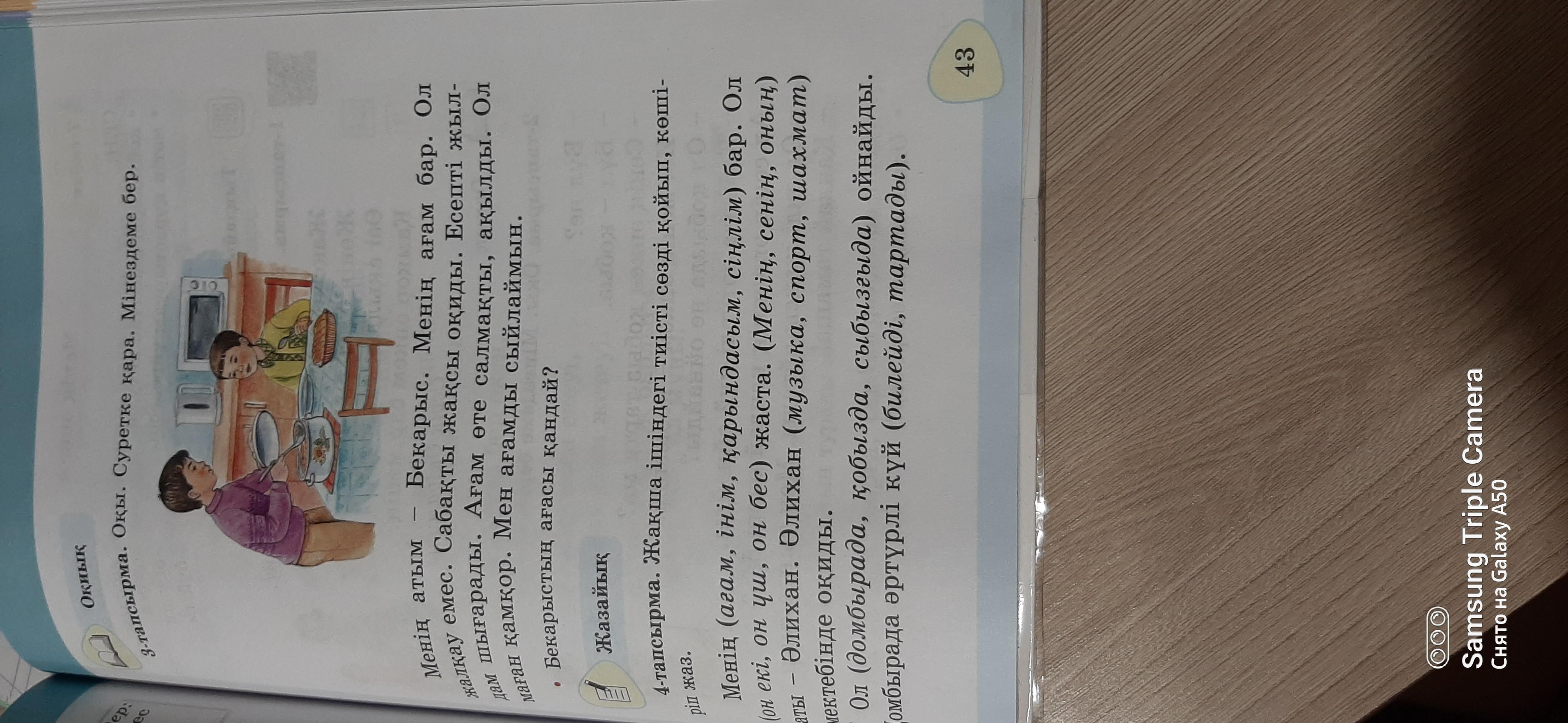 Менің ағам бар. Ол он бес жаста. Оның аты - Әлихан. Әлихан музыка мектебінде оқиды. Ол домбырада ойнайды. Домбырада әртүрлі күй тартады.