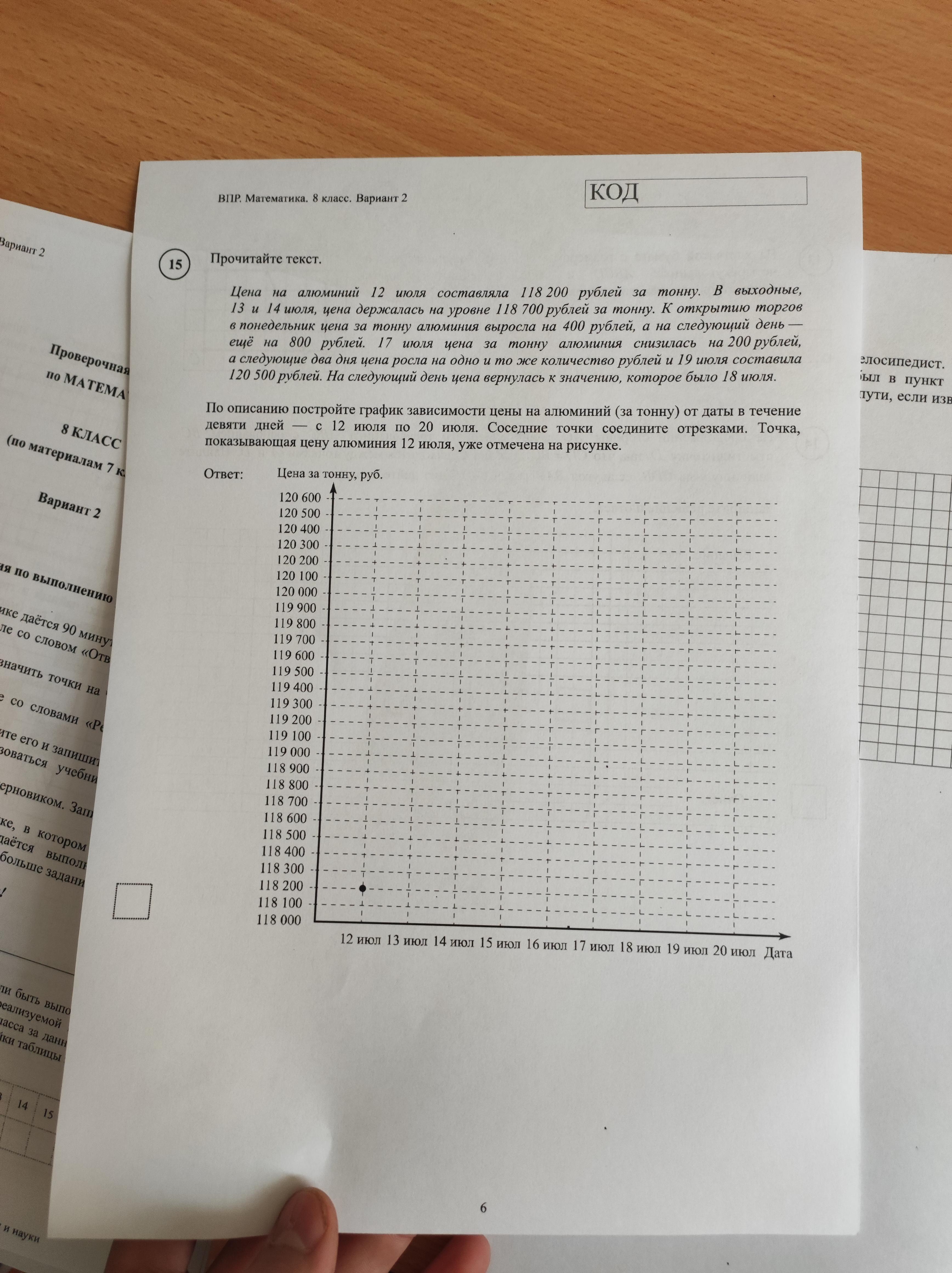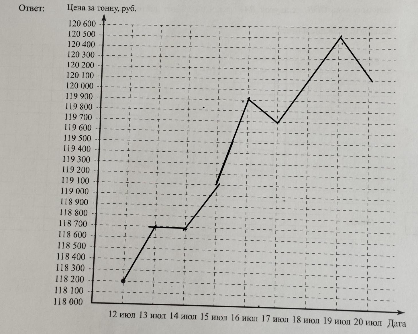 Цена на алюминий 12 июля составляла 118 200 рублей за тонну. В выходные 13 и 14 июля,цена держалась на уровне 118 700рублей.К открытию торгов в понедельник цена за тонну алюминия выросла на 400 рублей ,а на следующий день ещё на 800.17 июля цена за тонну цена за тонну алюминия снизилась на 200рублей,а следующие два дня цена росла на одно и тоже количество рублей и 19 июля составила 120 500 рублей .На следующий день цена вернулась к значению ,которое было 18 июля.По описанию постройте график зависимости цены на алюминий за тонну от даты в течение девяти дней -с 12 июля по 20 июля.Соседние точки соедините отрезками. Точка,показывающая цену алюминия 12 июля ,уже отмечена на рисунке
