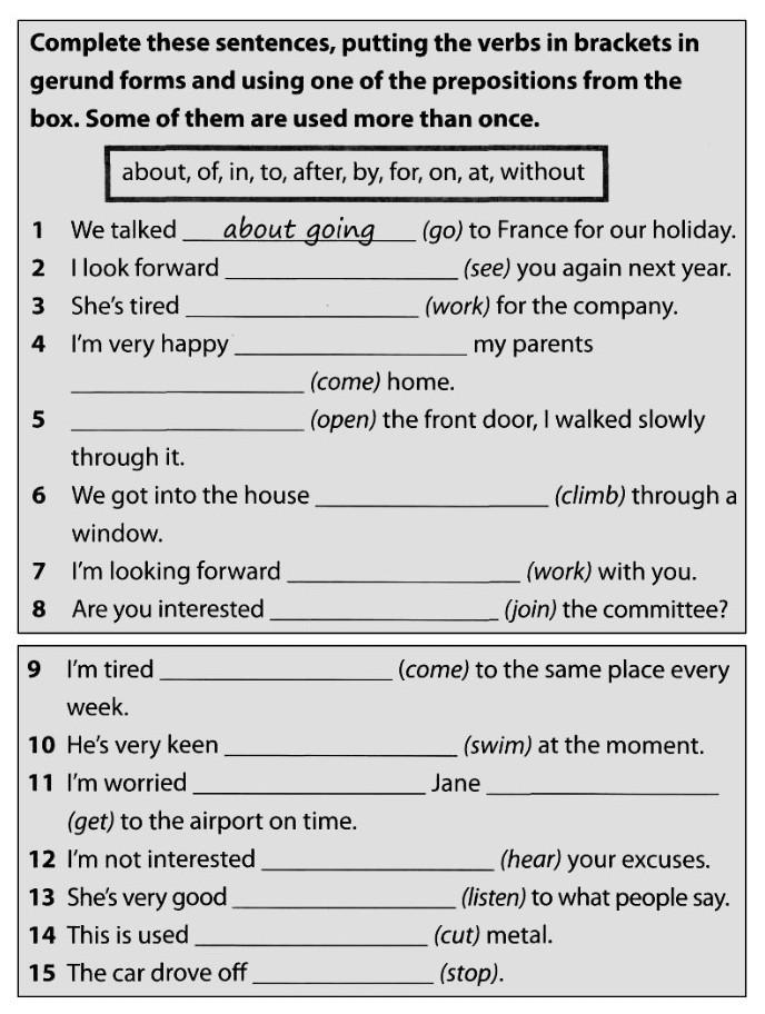 2.to seeing.3.of working.4.at my parents coming.5. without opening.6.by climbing.7.to working.8.in joining .9.of coming.10.on swimming.11.of Jane getting.12 .in hearing.13.at listening.14.for cutting.15. without stopping