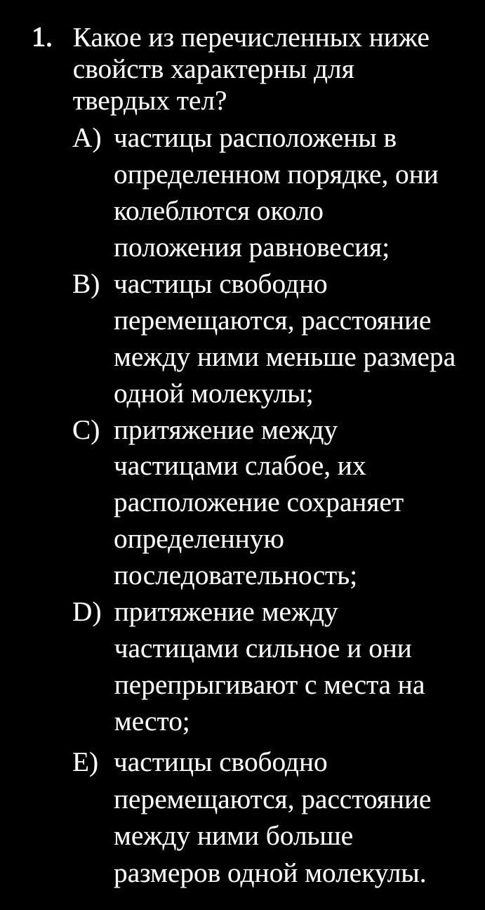 1. Какое из перечисленных ниже свойств характерны для твердых тел? A) частицы расположены в определенном порядке, они колеблются оКОЛО положения равновесия; В) частицы свободно перемещаются, расстояние между ними меньше размера одной молекулы; C) притяжение между частицами слабое, их расположение сохраняет определенную последовательность; D) притяжение между частицами сильное и оНИ перепрыгивают с места на место; E) частицы свободно перемещаются, расстояние между ними больше размеров одной молекулы.
