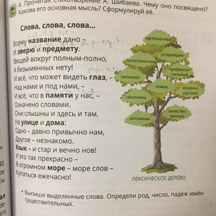 Выпиши выделенные слова. Определи род, число, падеж имен