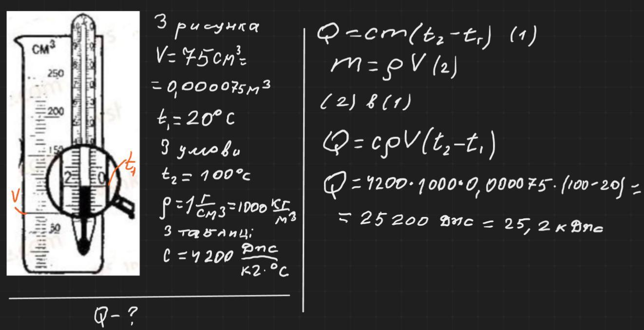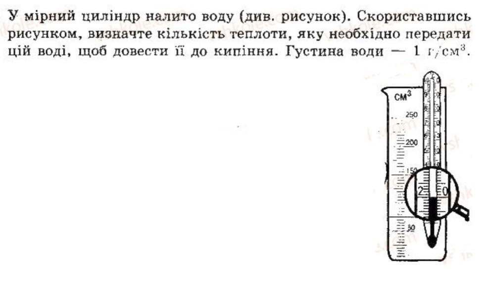 У мірний циліндр налито воду (див. рисунок). Скориставшись рисунком, визначте кількість теплоти, яку необхідно передати цiй воді, щоб довести її до кипіння. Густина води 1 г/см3.