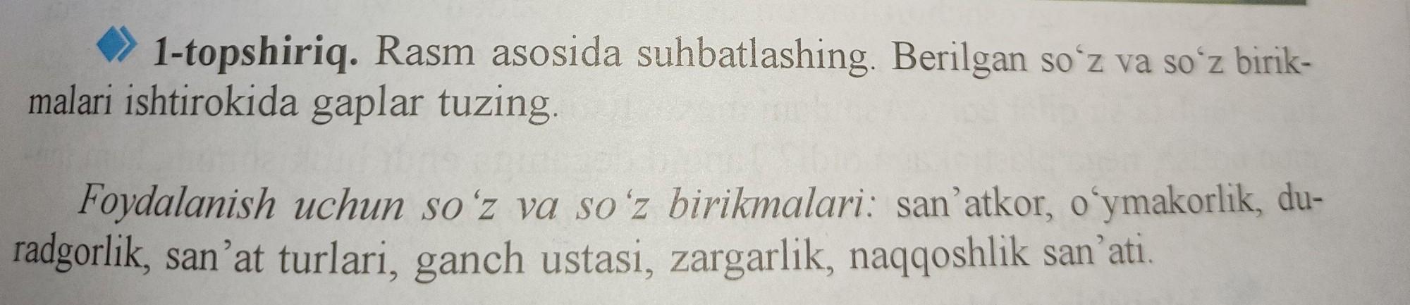 1-topshiriq. Berilgan so'z va so'z birikmalari ishtirokida gaplar tuzing.