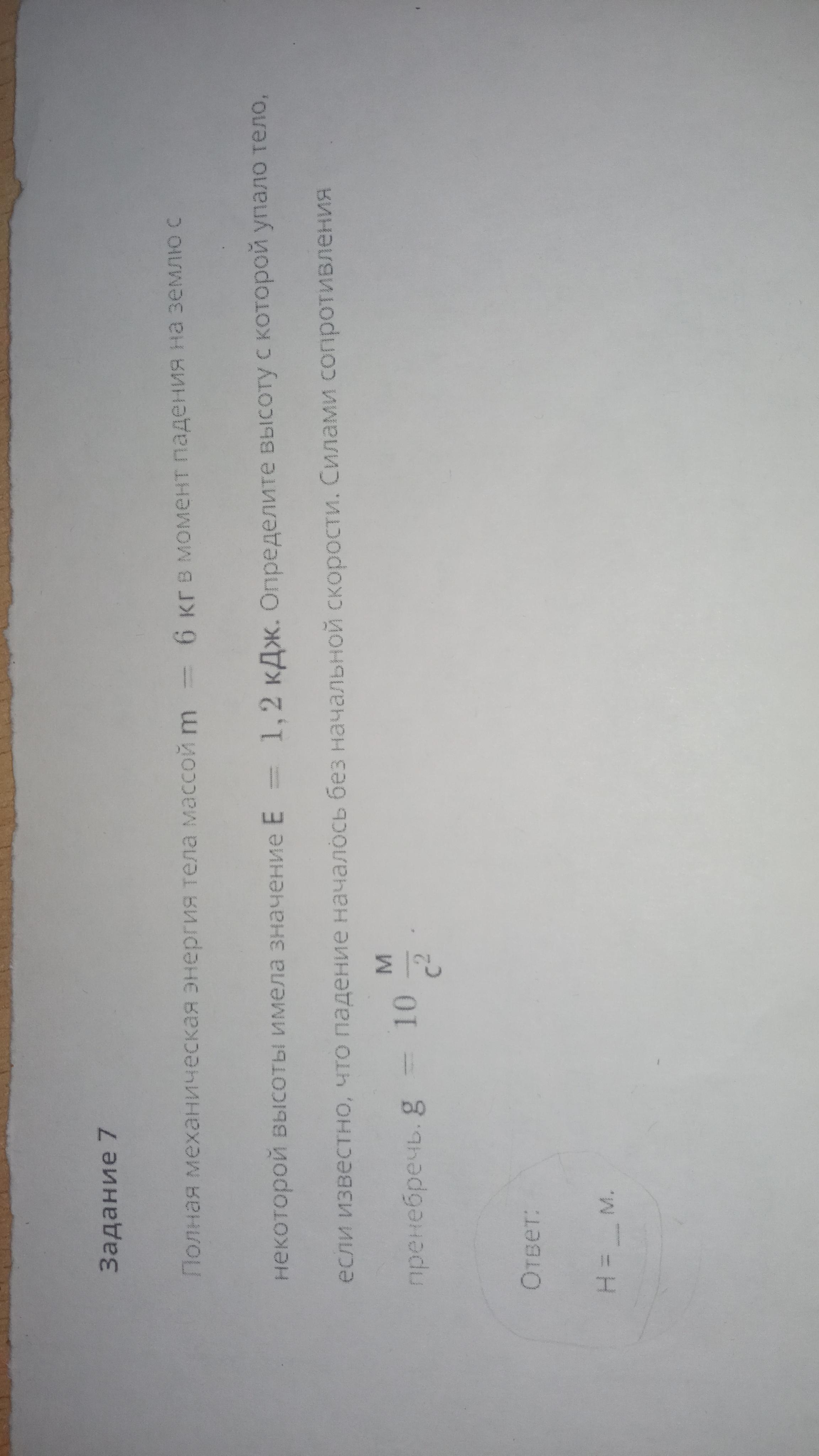 Полная механическая энергия тела массой m=6кг в момент падения на землю с некоторой высоты имела значение E = 1,2кДж. Определите высоту с которой упало тело, если известно, что падение началось без начальной скорости. Силами соправтивления пренебречь. g = 10 m/c²