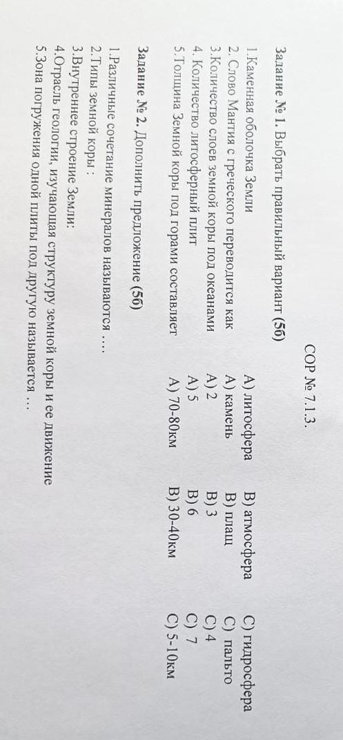 Задание № 2. Дополнить предложение (56) 1.Различные сочетание минералов называются .... 2. Типы земной коры : 3.Внутреннее строение Земли: 4.Отрасль геологии, изучающая структуру земной коры и ее движение 5.Зона погружения одной плиты под другую называется ...