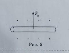 помогите. (2 балла) На рис. 5 указано направление линий магнитного поля и направление силы Ампера, действующей на проводник с током со стороны магнитного поля. (Значок «•» показывает, что магнитная линия направлена к нам.) Определите и укажите на рисунке направление тока в про воднике.