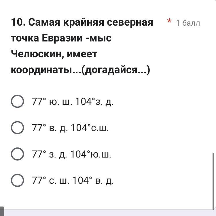Ответ: 77°43′00″ с. ш. 104°18′00″ в. д. (4)