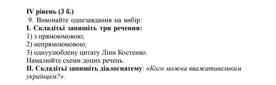9. Виконайте однезавдання на вибір: І. Складітьі запишіть три речення: 1) з прямоюмовою; 2) непрямоюмовою; 3) однуулюблену цитату Ліни Костенко. Намалюйте схеми доцих речень. ІІ. Складітьі запишіть діалогнатему: «Кого можна вважативеликим українцем?