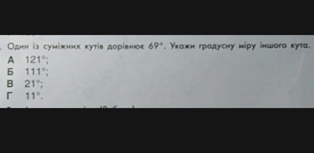 Один із суміжних кутів дорівнює 69°. Укажи градусну міру іншого кута.