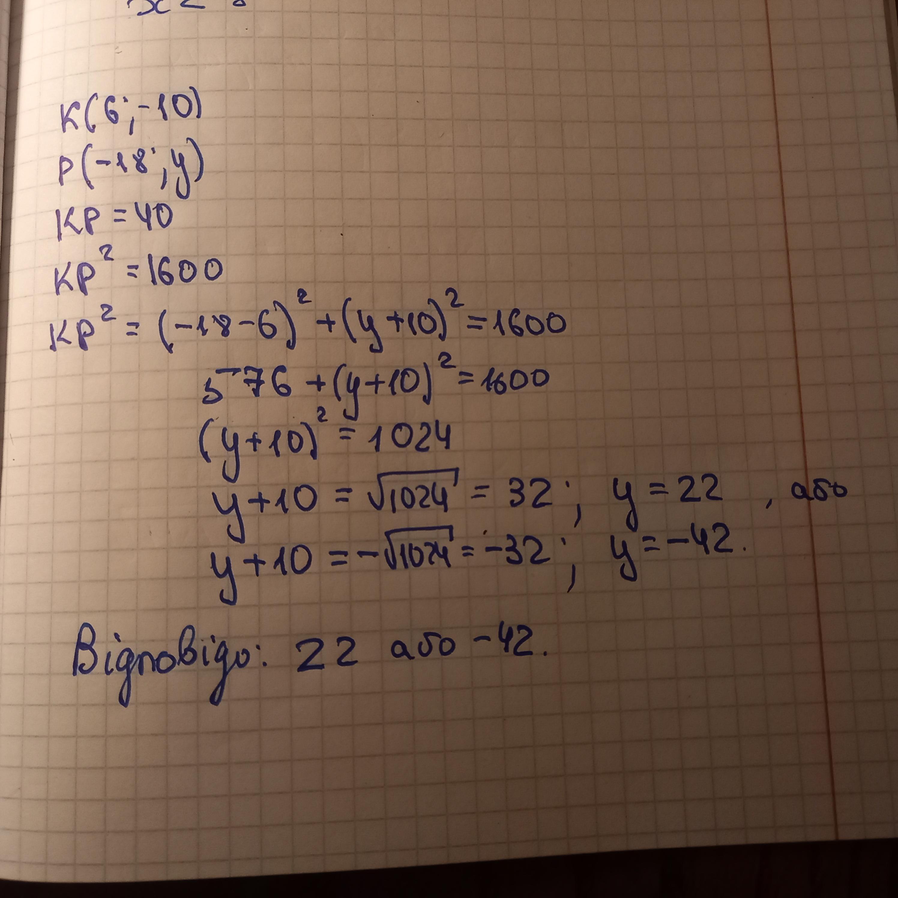 При якому значенні у довжина відрізка КР буде дорівнювати 40, якщо К( 6; -10) і Р( - 18; у) ?
