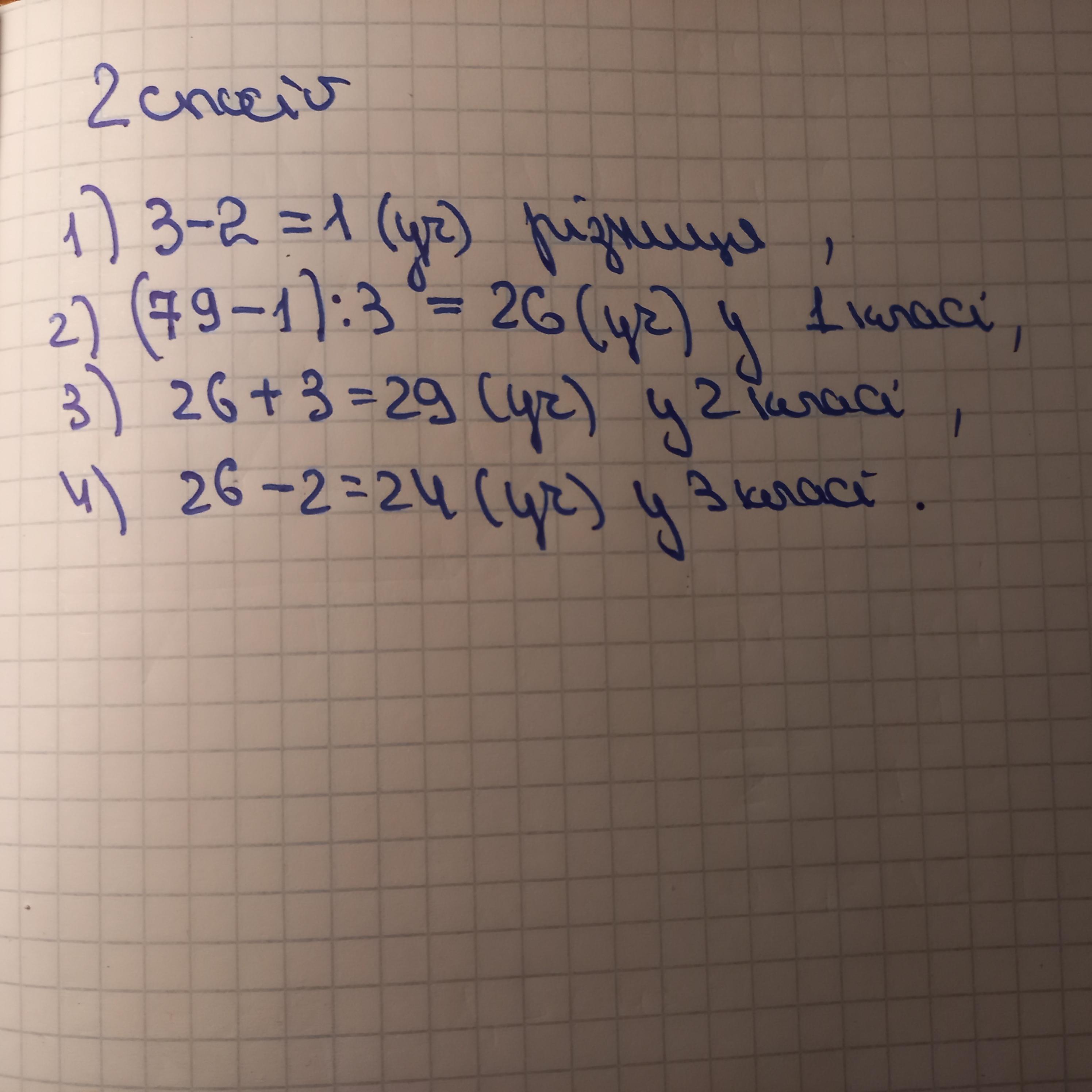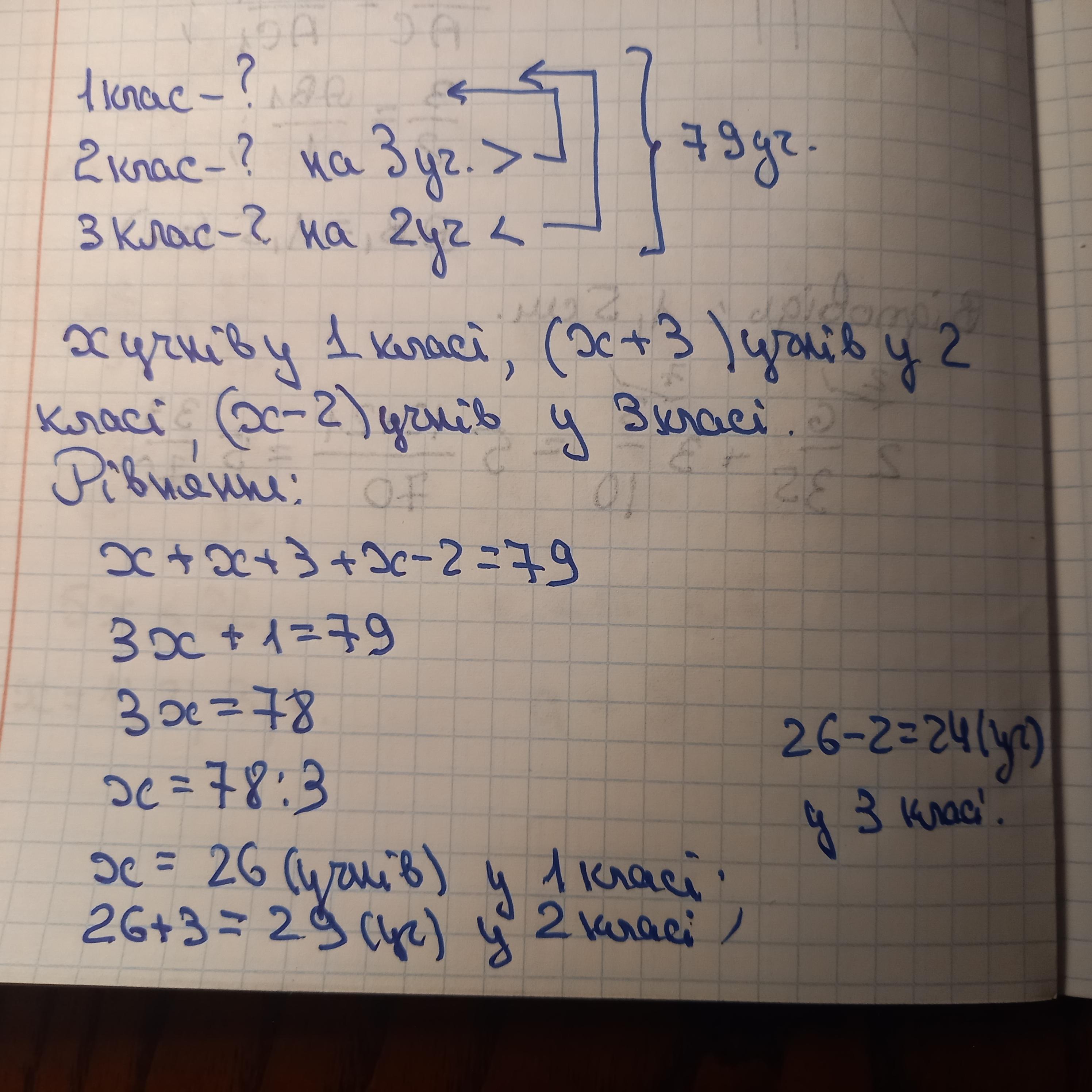 У трьох класах всього 79 учнів У другому на 3 учні біліше ніж у першому а в третьому на 2 менше ніж у першому Скільки учнів у кожному класі