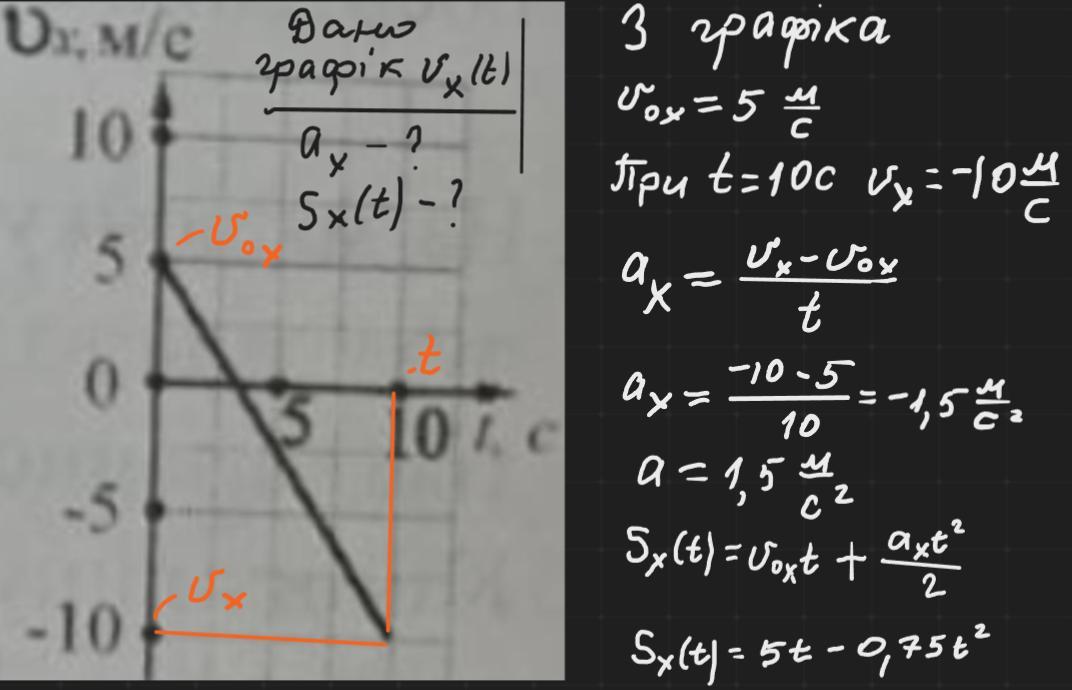 На малюнку зображено графік залежності Vx(t) для руху тіла вздовж осі 0х. Визначити прискорення руху тіла та записати рівняння залежності Sx(t)
