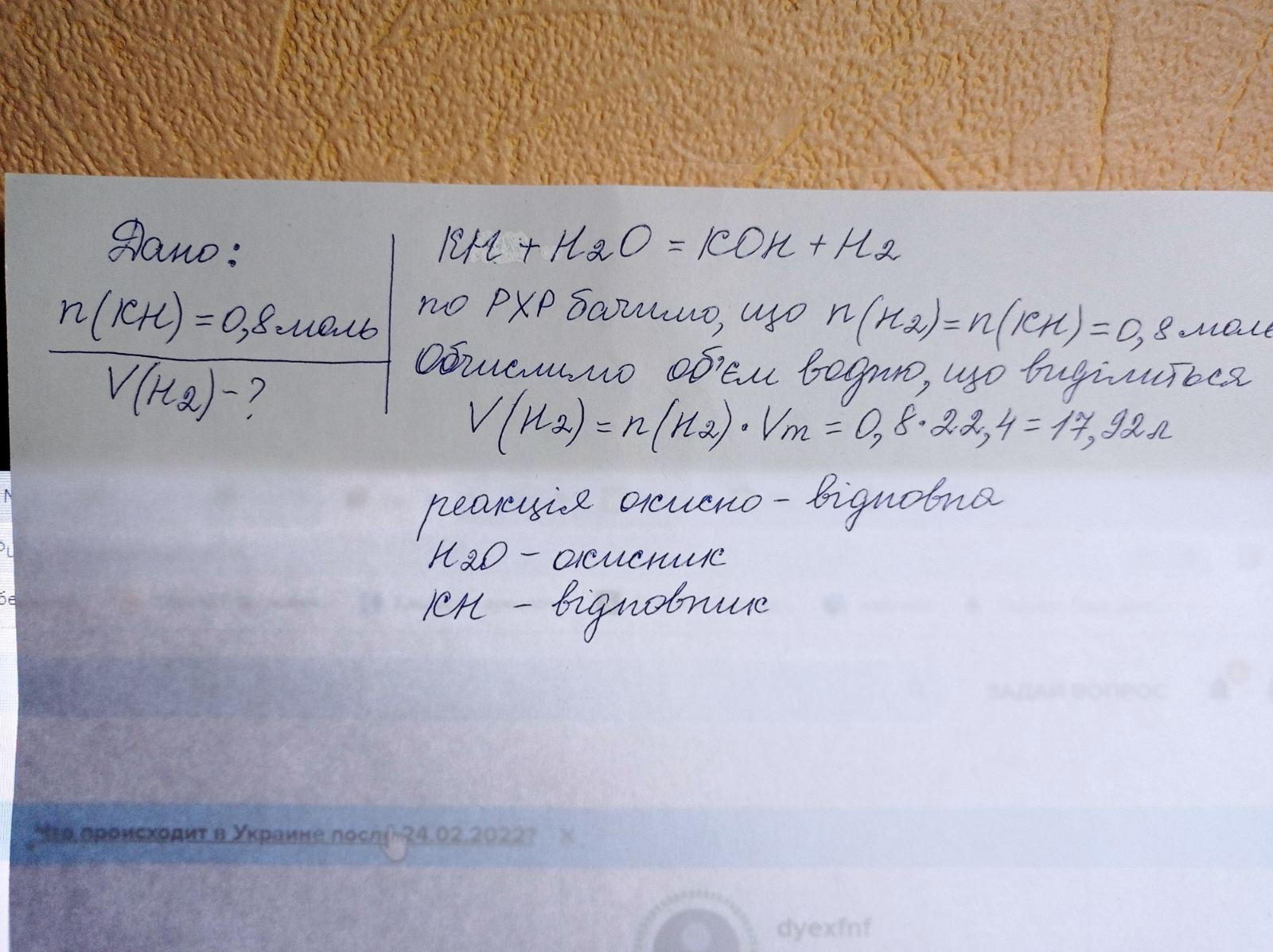 Калій гідрпд розкладається водою з утворенням калій гідрокспду і водню. Напишіть рівняння реакції та встановіть, чи можна ії зарахувати до окисно-відновних. Який об'єм водню виділиться, якщо з водою прореагує 0,8 моль калій гідриту?