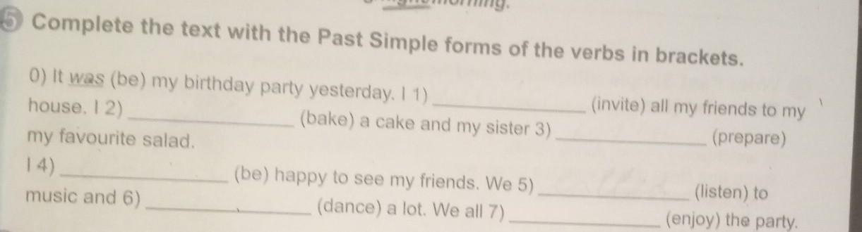 Complete the text with the Past Simple forms of the verbs in brackets. 0) It was (be) my birthday party yesterday. I 1) house. I 2) (invite) all my friends to ma (prepare) my favourite salad. 14) music and 6) (bake) a cake and my sister 3) (be) happy to see my friends. We 5) (dance) a lot. We all 7) (listen) to (enjoy) the par