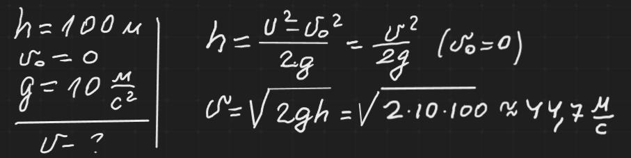 U = √2gh = √2 * 10 * 100 = √2000 ≈ 44,7 м/с