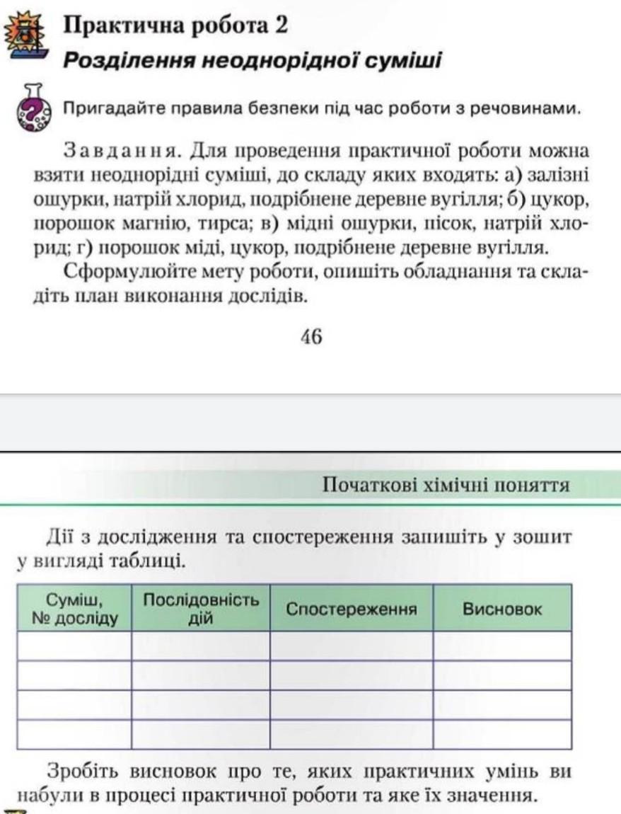 завдання для проведення практичної роботи можна взяти неоднорідні суміші до складу яких входять а)залізні ошурки ,натрій,подрібнення деревне вугілля б)цукор,порошок магнію ,тирса,в) мідні ошурки ,пісок,натрій хролид г)порошок міді,цукор ,подрубнене деревне вугілля сформулюйте мету роботи ,опишіть обладнання та складіть план виконання дослідження будьласкааа