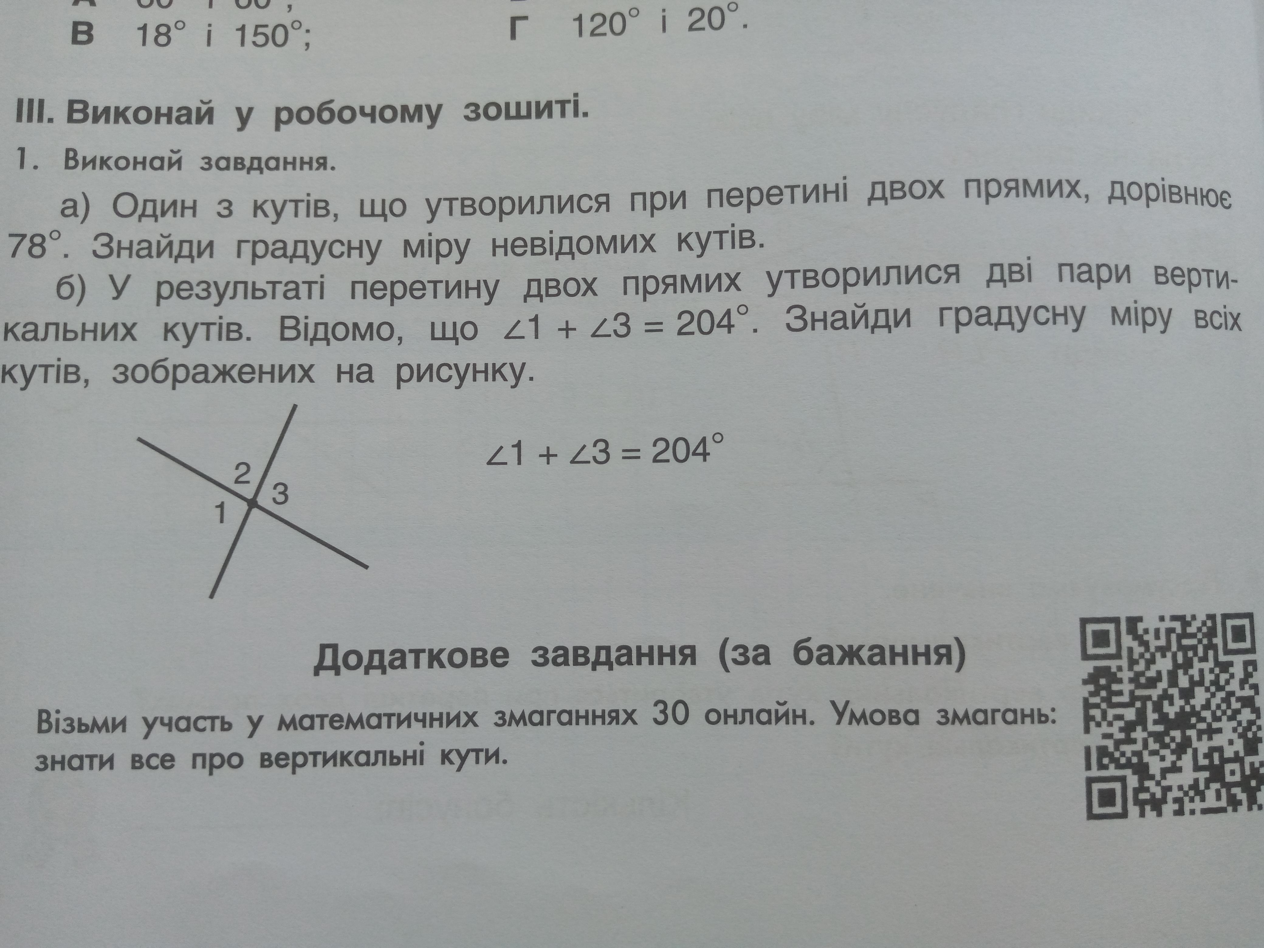 Відомо що ∠1 +∠3=204° .За властивістю вертикальних кутів протилежні ∠ рівні, тоді ∠1=∠3=204°:2=102°.Щоб знайти ∠2 і ∠4, потрібно (360°-204°):2=156°:2=78°.