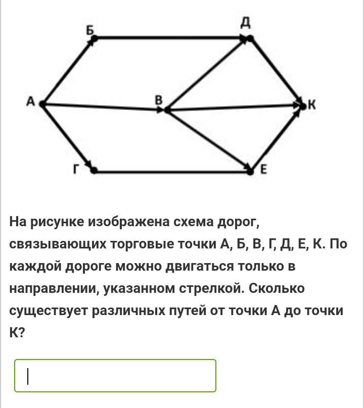 На рисунке изображена схема дорог, связывающих торговые точки А, Б, В, Г, Д, Е, К. По каждой дороге можно двигаться только в направлении, указанном стрелкой. Сколько существует различных путей от точки А до точки К?