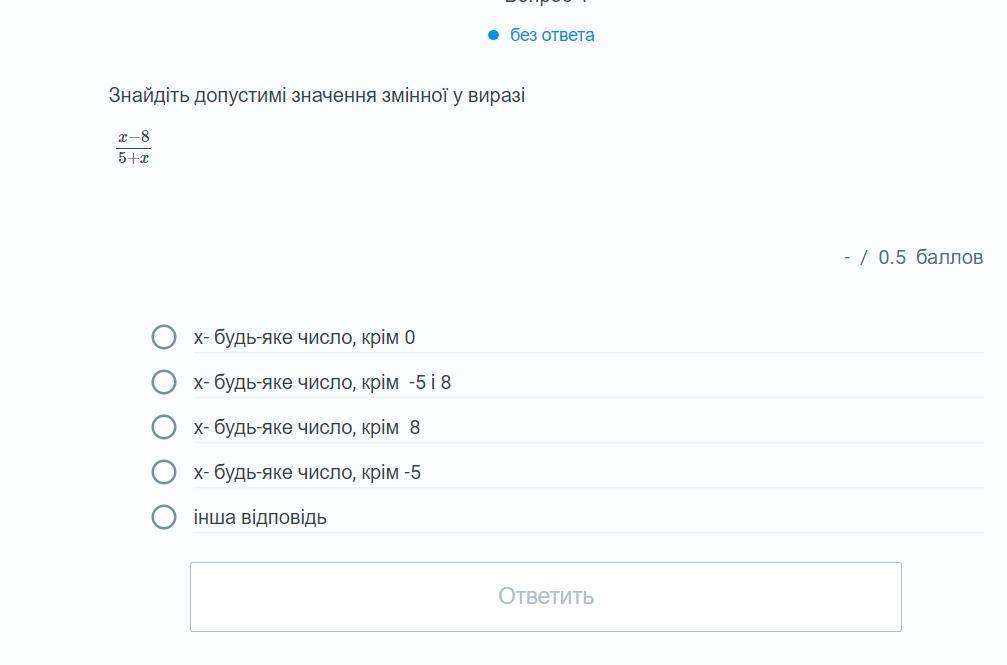 5+x не равно 0 => x не равен -5 ответ 4 сверху