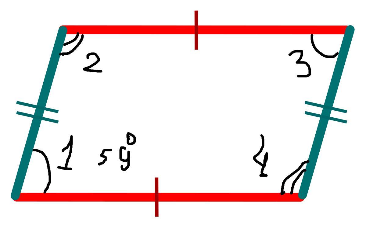 За властивістю паралелограма, його протилежні кути рівні, тоді ∠1=∠3=59°, а ∠2=∠4.Щоб знайти невідомі ∠, треба 360°-∠1-∠3=360°-59°-59°=242°. Так, як ∠2=∠4, вони дорівнюють 242°:2=121°.