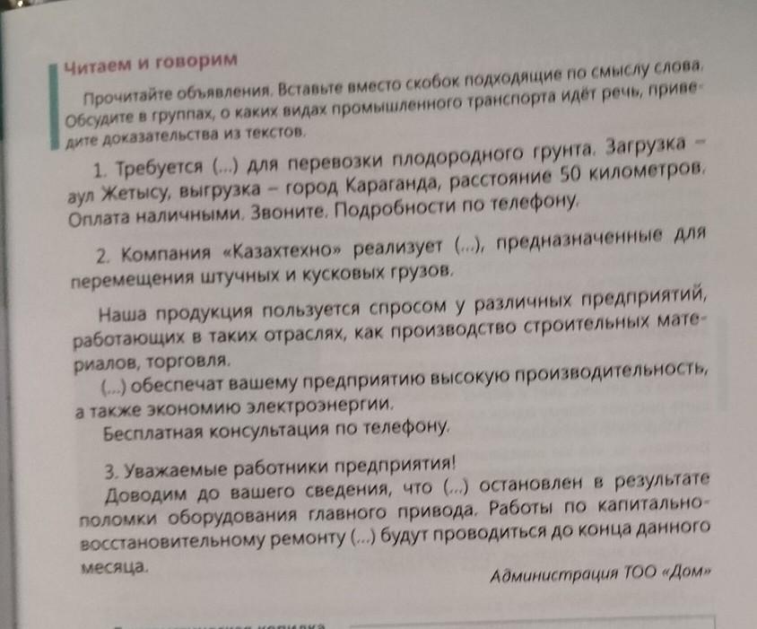 Читаем и говорим по смыслу слова Прочитайте объявления Вставьте вместо скобок подход Обсудитe в группах, о каких видах промышленного транспорта идёт речь, приве дите доказательства из текстов. 1. Требуется (...) для перевозки плодородного грунта. Загрузка - аул Жетысу, выгрузка-город Караганда, расстояние 50 километров. Оплата наличными. Звоните. Подробности по телефону. 2. Компания «Казахтехно» реализует (-), предназначенные для перемещения штучных и кусковых грузов Наша продукция пользуется спросом у различных предприятий работающих в таких отраслях, как производство строительных мате- риалов, торговля. (...) обеспечат вашему предприятию высокую производительность а также экономию электроэнергии. Бесплатная консультация по телефону. 3. Уважаемые работники предприятия! Доводим до вашего сведения, что (-) остановлен в результате поломки оборудования главного привода. Работы по капитально- восстановительному ремонту (...) будут проводиться до конца данного Администрация TOO "Дом".