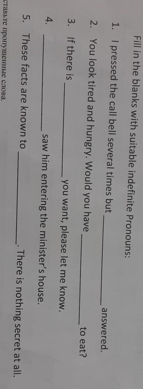 Fill in the blanks with suitable indefinite Pronouns: 1. I pressed the call bell several times but 2. You look tired and hungry. Would you have 3. If there is 4. 5. These facts are known to Вставьте пропущенные слова. answered. you want, please let me know. saw him entering the minister's house. to eat? There is nothing secret at all.